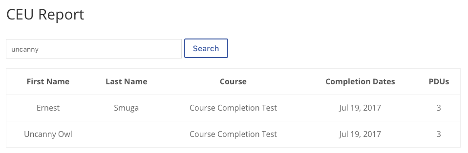 Where the plugin gets especially interesting is with our front end reporting. With some important steps to protect privacy, we’ve created a front end report that allows learners, managers, accrediting organizations and others verify course completion and credit records for students. No user account is required to query the CEU records and full completion details are published in the front end (as long as the person searching knows a learner’s name or email address).