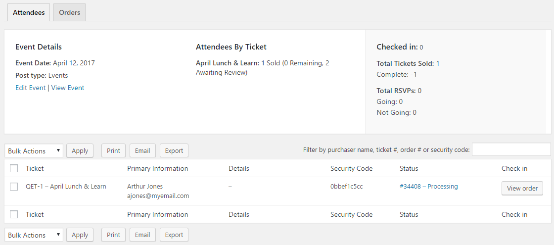 The attendees page includes a list of attendees and issued tickets, including the customer’s name, email, ticket ID and unique ticket security code: