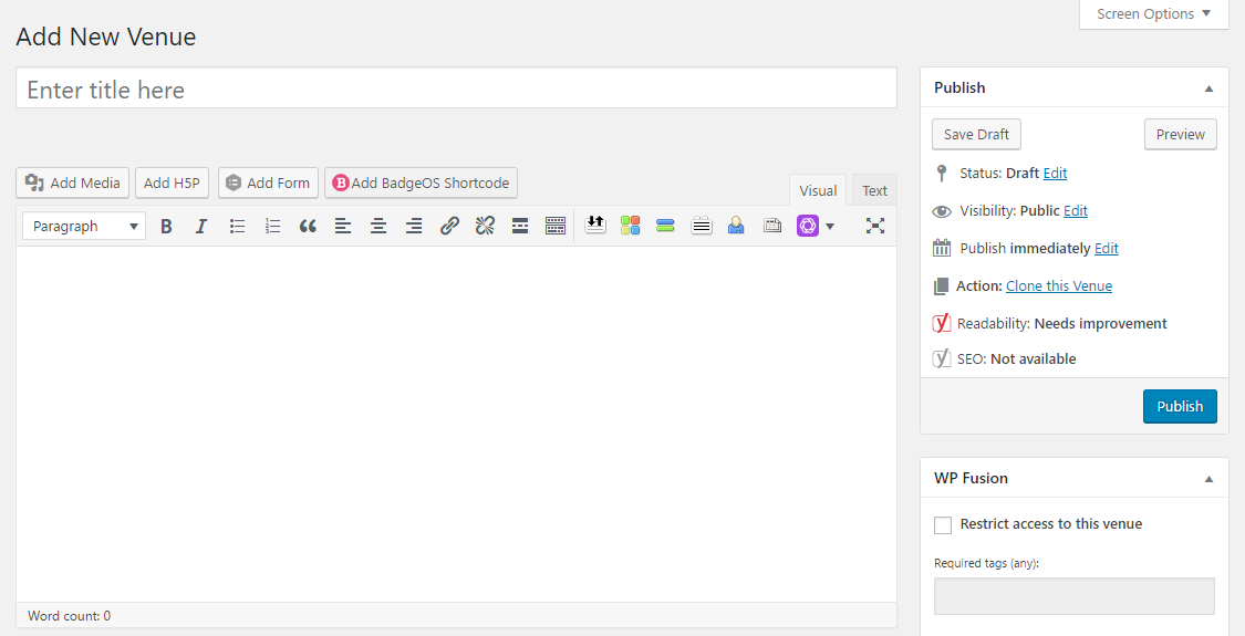 - Go to Events > Venues > Add New. You’ll notice the venue editor looks very similar to a page/post.