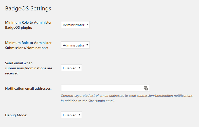 The first drop-down menu lets you choose the minimum role allowed to administer the BadgeOS system. Administrator is the default but you can change it to Author or Editor.