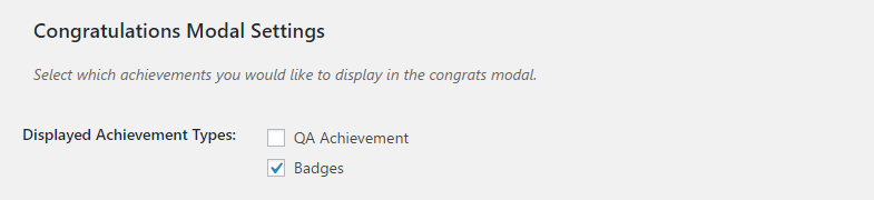 By default, the “Congratulations” add-on to BadgeOS automatically displays an overlay pop-up window congratulating users as they earn achievements. You have the option to turn on or off pop-up messages for specific Achievement Types.