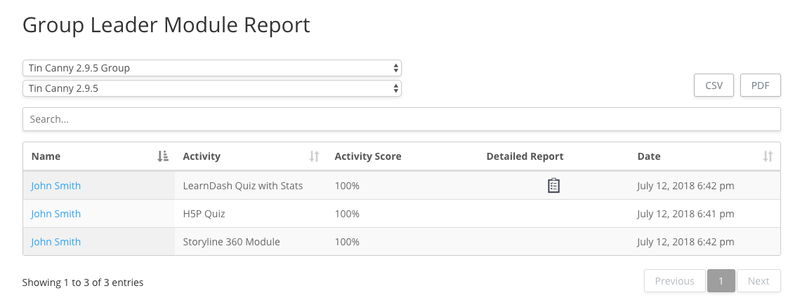 Front End Quiz Reports: Reports that combine both LearnDash quiz scores with SCORM/xAPI scores recorded in Tin Canny to present a consolidated view of test data for Group Leaders, Administrators or Students.
