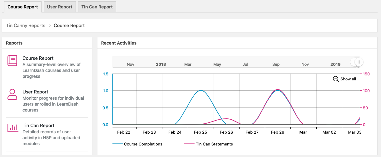 Dashboard Widget: See LearnDash course completion and Tin Can/SCORM statement trends at a glance in your WordPress dashboard.