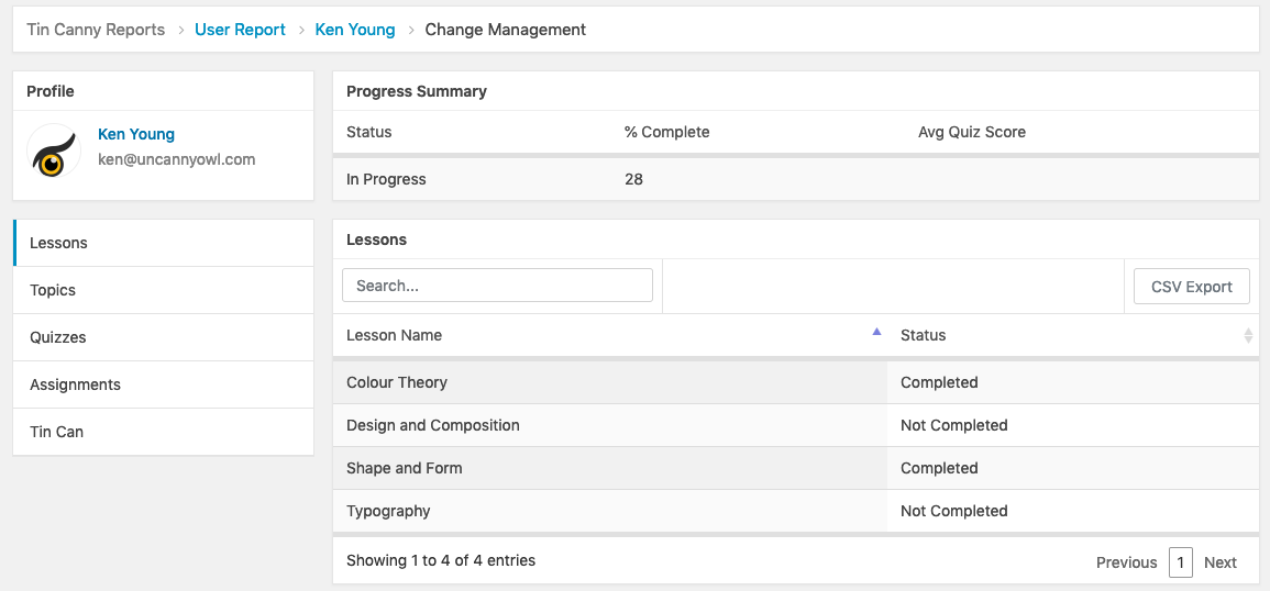 The reports are for LearnDash Group Leaders too! Group Leaders have access to the same reports for users in the groups they support. Even better, Tin Canny allows the Course and User reports to be shown in the front of your WordPress site, making it even easier to keep your Group Leaders in a familiar environment!