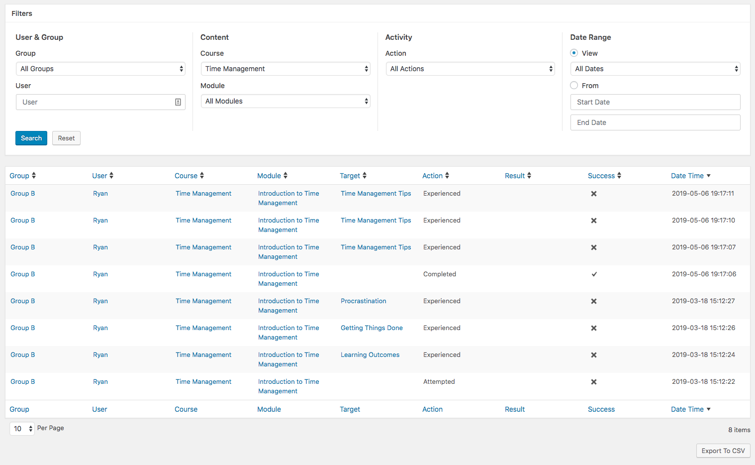 Detailed Drill Down User Reports: Drill down to review LearnDash, Tin Can and SCORM activity by individual user and course.