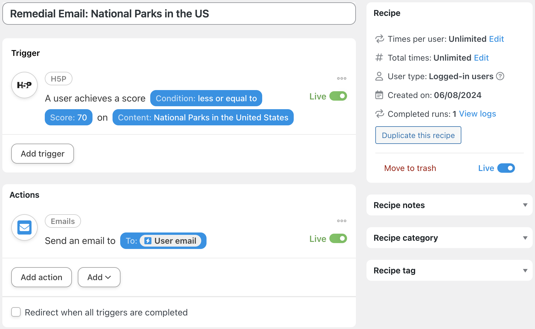 In the recipe pictured below, for example, we’re able to send an email to learners who score at or below a threshold with links to remedial content.