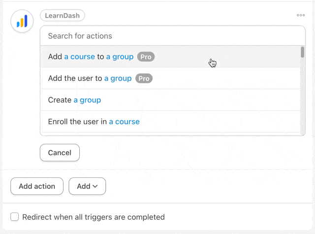 We could also choose from any number of LearnDash specific actions, from adding learners to groups or enrolling them in courses based on their H5P content completions.