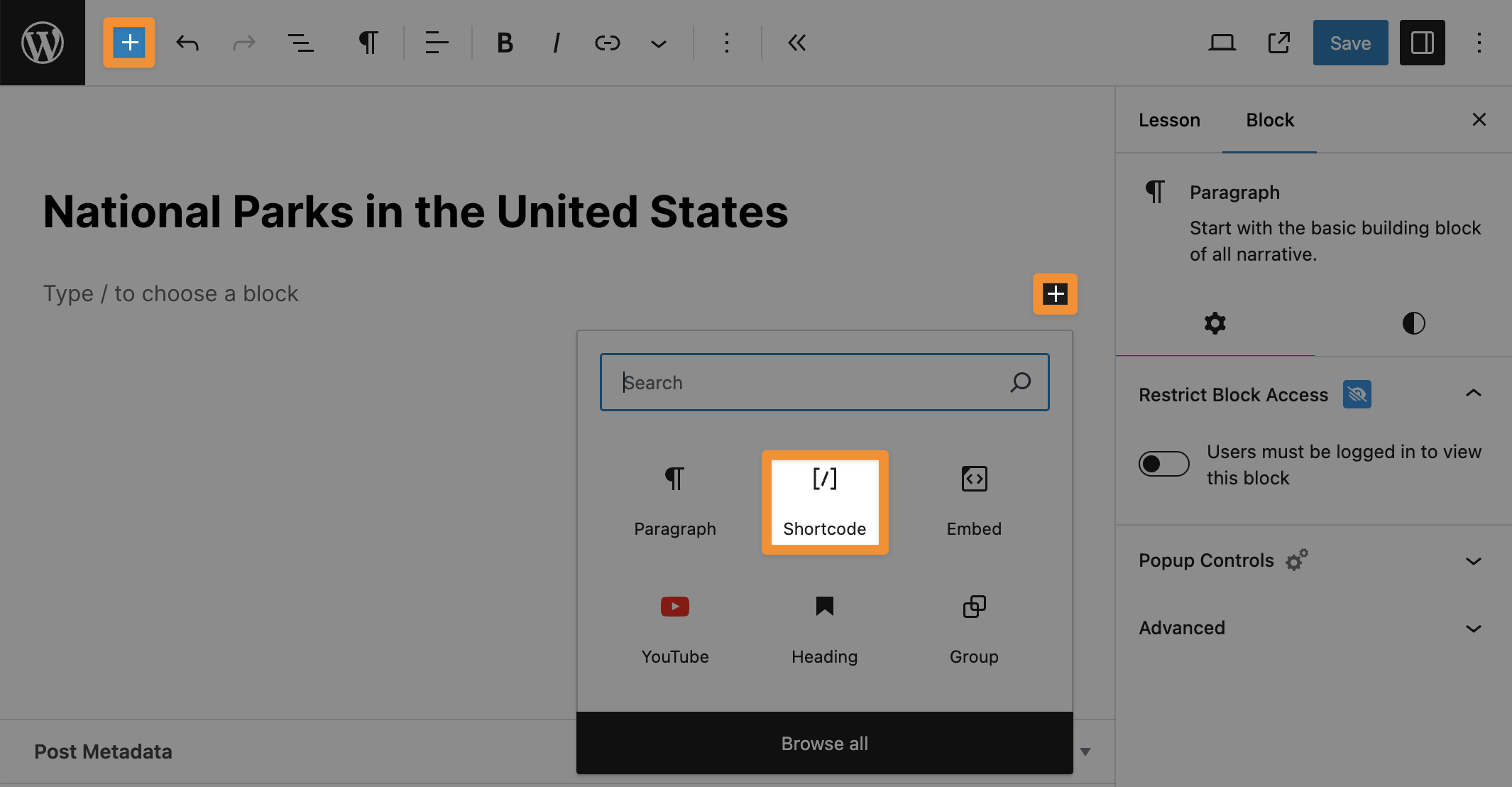 In the Lesson or Topic page, click the Plus sign “+” to add a block and select the Shortcode block.