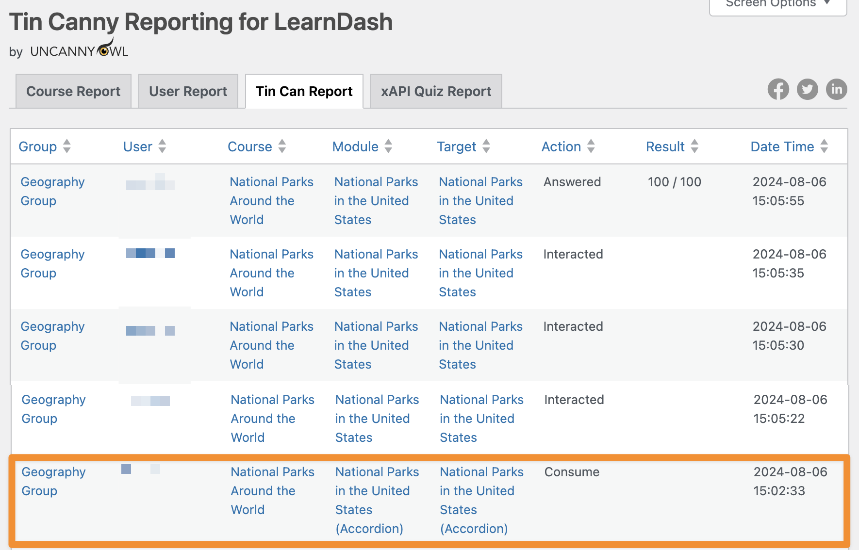 Tin Canny includes useful filters so that you can generate reports based on types of interactions, users, courses groups and more.