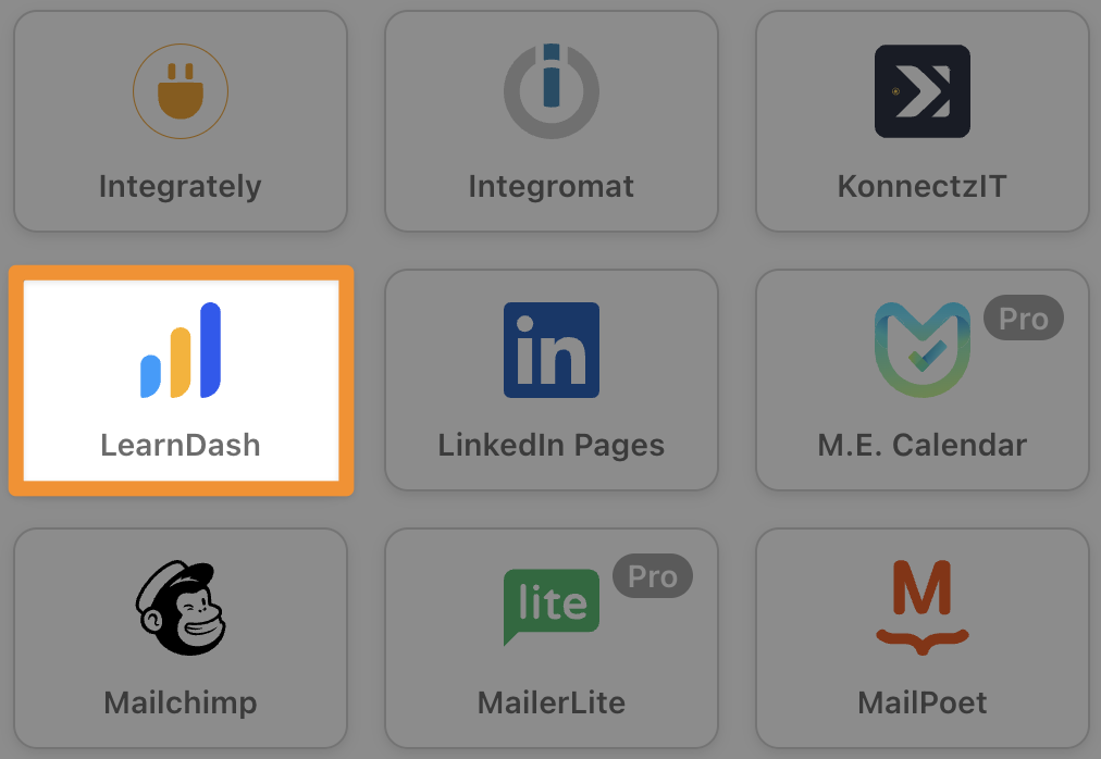 Next, within the user loop, click Add action and select LearnDash from the menu of available integrations.