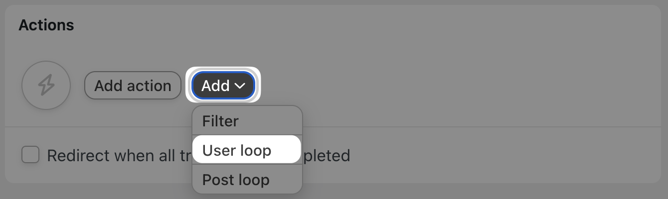 In the Actions panel, click Add and select User loop from the drop-down list.