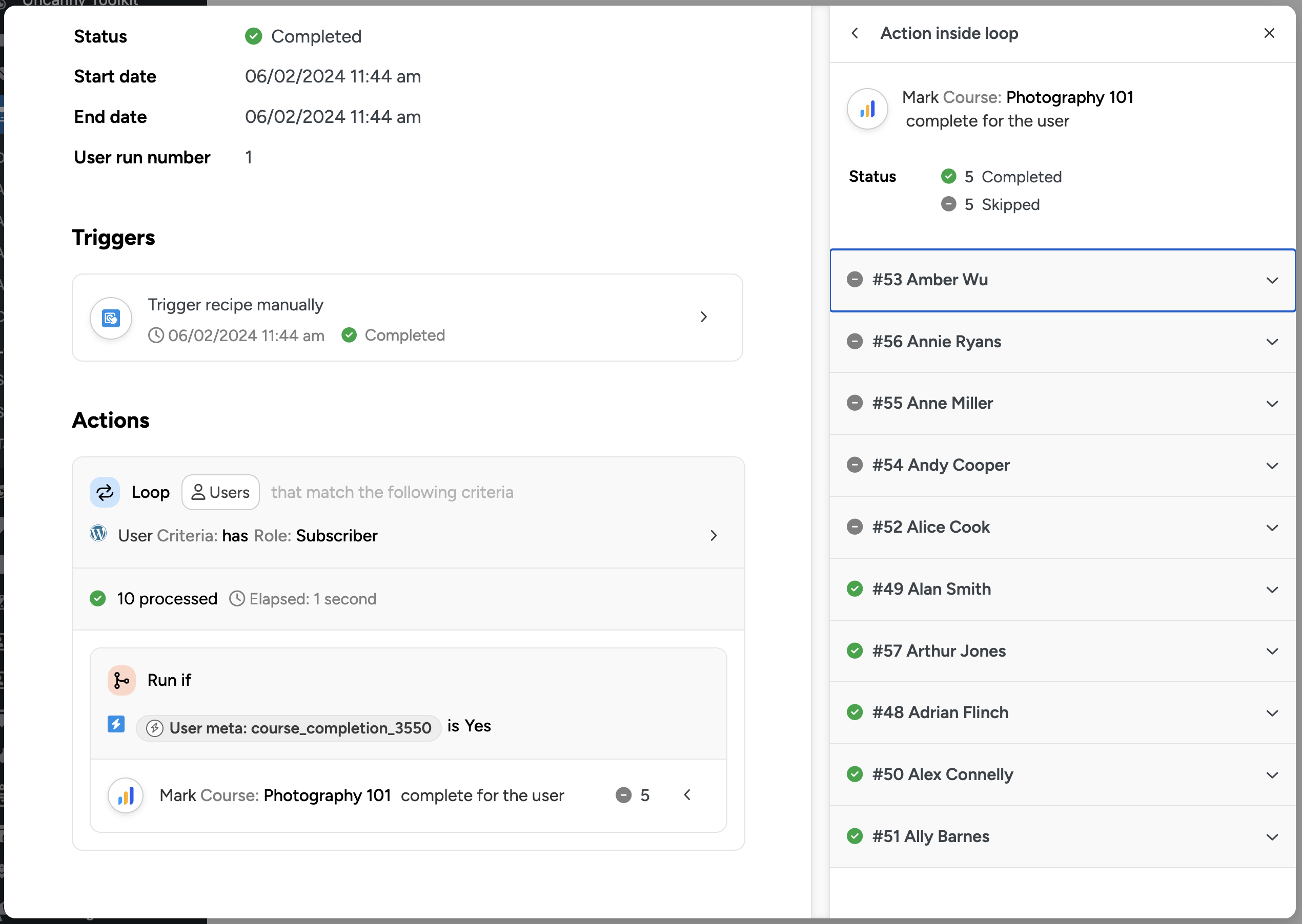 Once you click Run now, Automator will cycle through every user on your WordPress website that satisfies the user loop filter(s) and mark the LearnDash course complete for them if they have the user meta value(s) that you’ve specified.
