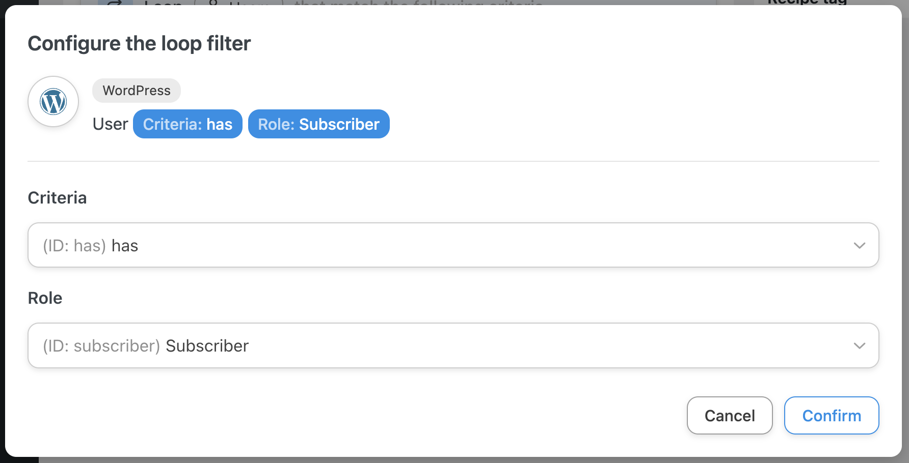 By default, Automator will run user loops on all users who do not have the role “Administrator” in WordPress. You can, however, change the user loop filter by hovering over it, clicking on the Edit filter icon and changing the conditions of the filter. For example, we have altered the conditions so that the user loop will only run on users with the role “Subscriber”.