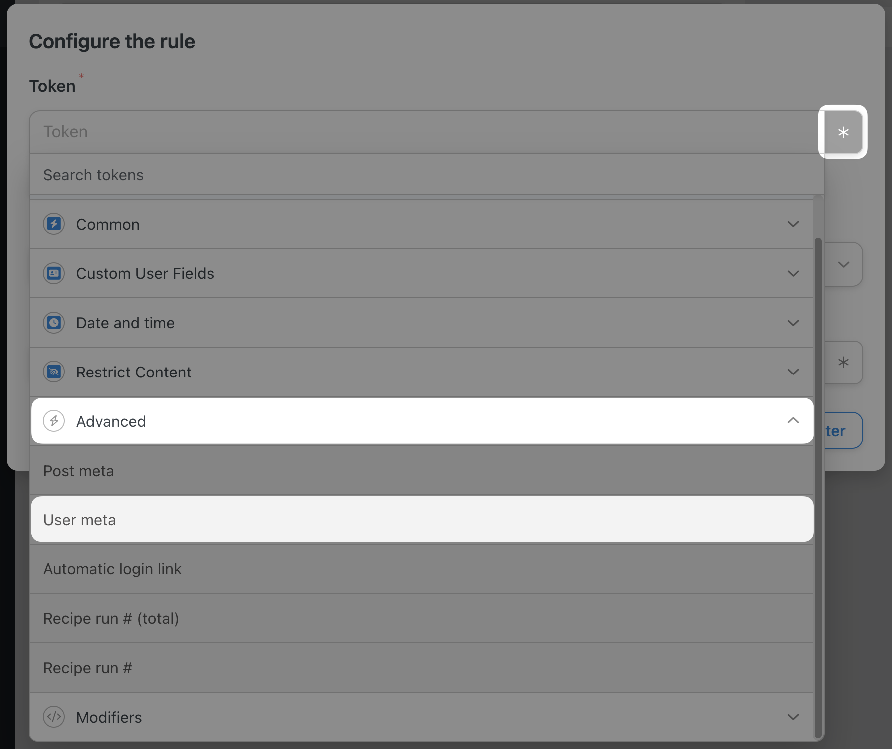 Automator will prompt you to configure the rule that defines the condition for the token. In the Token field, click the Asterisk and select Advanced > User meta from the drop-down list that appears.