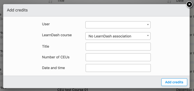 If the credits are not related to a LearnDash course, a title, number of credits and the date/time for awarding the credits must be entered.