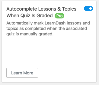 When lesson or topic quizzes are manually graded in LearnDash (and the user receives a passing mark), users have to return to the associated lesson or topic to manually mark it complete. When enabled, this module automatically marks the lesson or topic associated with the quiz complete so the learner doesn’t have to take that step.