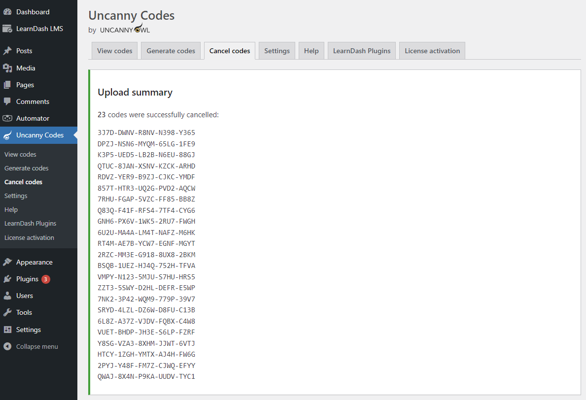Once you’ve uploaded the .csv, you’ll see a confirmation of the codes that were cancelled: