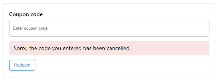 Codes that have been cancelled can no longer be redeemed by users. Upon redemption, they will see an error message indicating the code has been cancelled:
