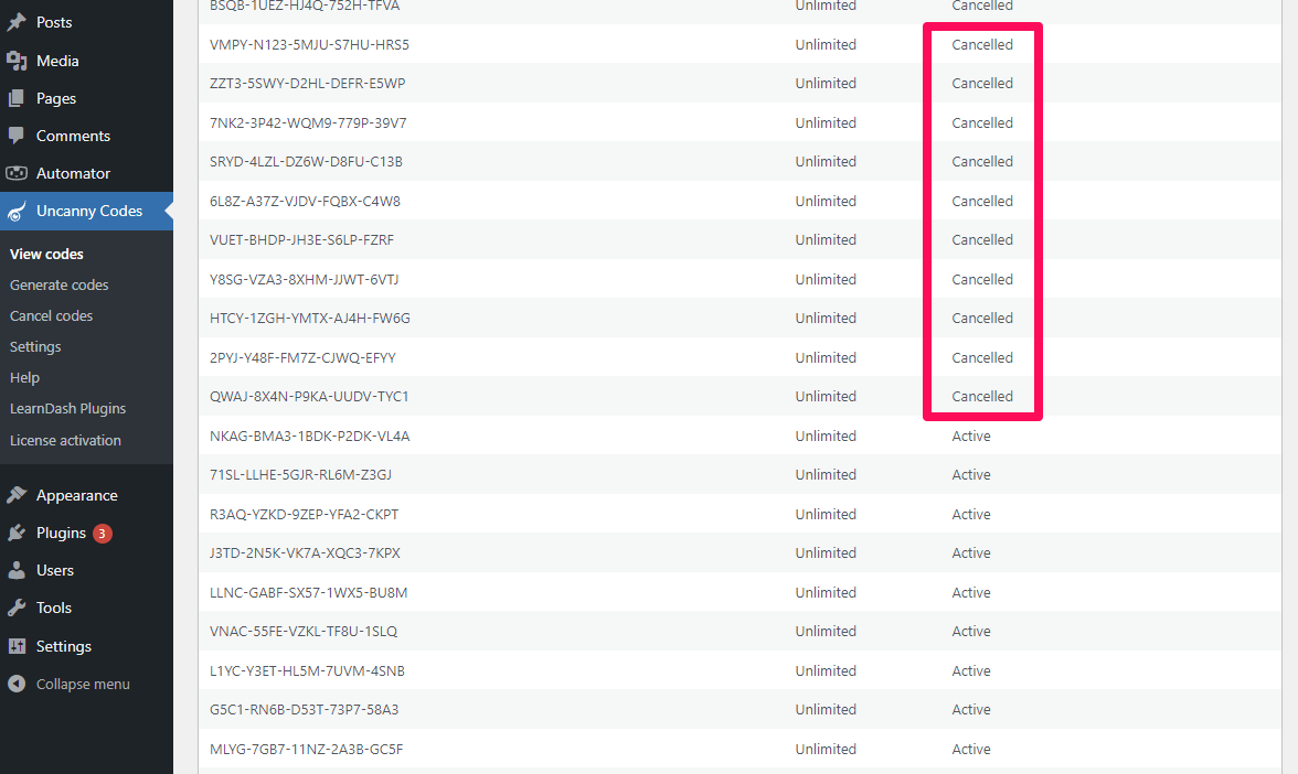 The code batch page will also indicate the codes that have been cancelled: