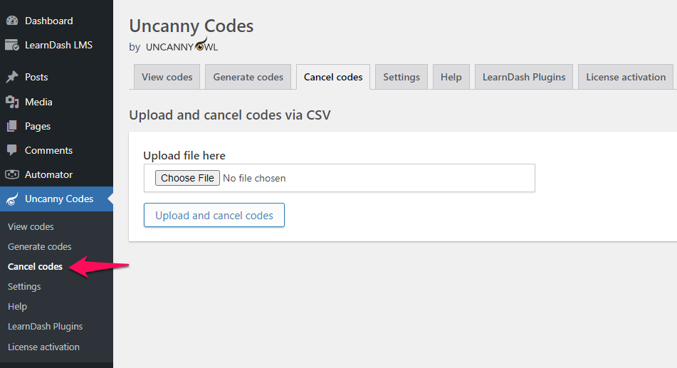 Once you have the .csv, go to Uncanny Codes > Cancel codes and upload the .csv: