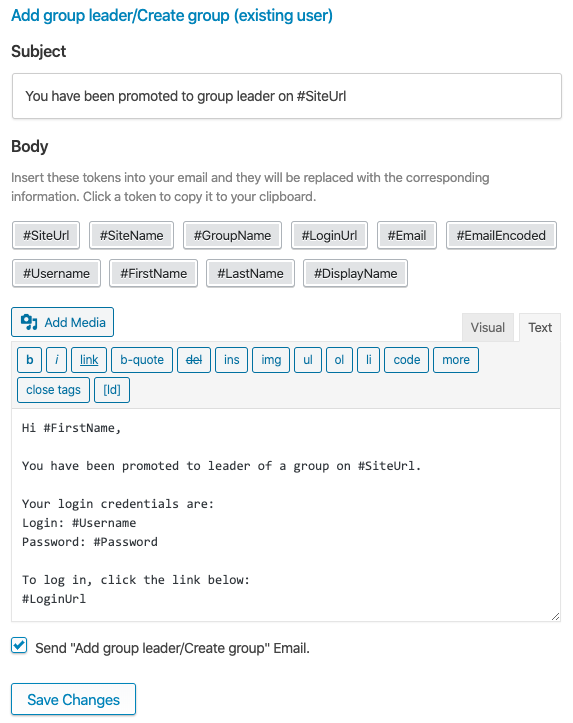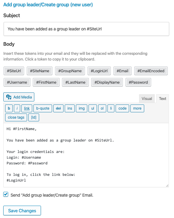 The Add group leader/Create group (new user) email is sent when a Group Leaders clicks Add Group Leader, or when an admin creates a new group using Uncanny Groups > Create Group, and the specified email address is not yet registered on the site. When this email is sent, the user is automatically registered as a new WordPress user and added to the LearnDash Group as a Group Leader. This template includes the #Password variable because passwords are randomly generated for new users. If you would prefer to have users select their own password, you can include a link to your site’s password reset page along with instructions to reset their password.