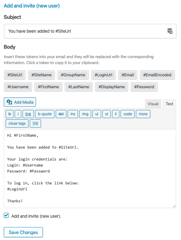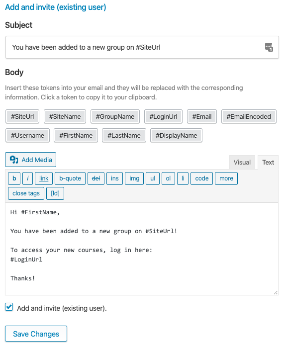 The Add and invite (new user) email is sent when a Group Leader selects the Add and invite option in the Add user dialog, and the user is not already registered on the site. When this email is sent, the user is automatically registered as a new WordPress user and added to the LearnDash Group. This template includes the #Password variable because passwords are randomly generated for new users. If you would prefer to have users select their own password, you can include a link to your site’s password reset page along with instructions to reset their password.
