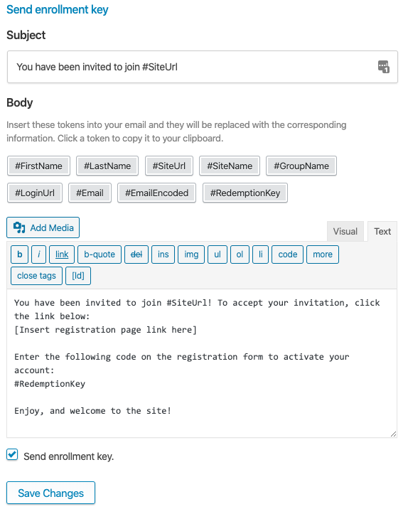 The Send enrollment key email is sent to new users when a Group Leader selects the Send enrollment key option in the Add User dialog. Unlike the Add and invite option, when this email is sent, users are not automatically registered on the site. So this email must contain clear instructions for registration. In this email template, make sure you include the #SiteUrl or #LoginUrl variable (so users can find their way to the registration form), and the #RedemptionKey variable which is the key for group enrollment.