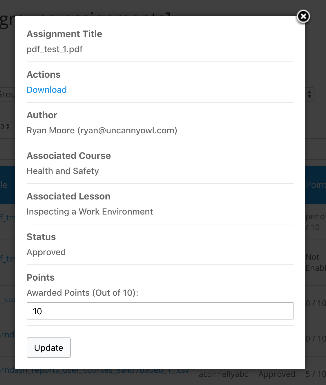 - Click the assignment title to open a modal dialog that shows the assignment details and allows you to assign points (if points are enabled for the assignment) and/or approve the assignment.