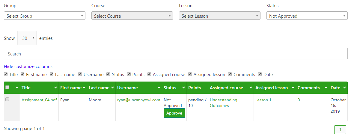 columns="Title, Student, Status, Points, Assigned Course, Assigned Lesson, Comments, Date"