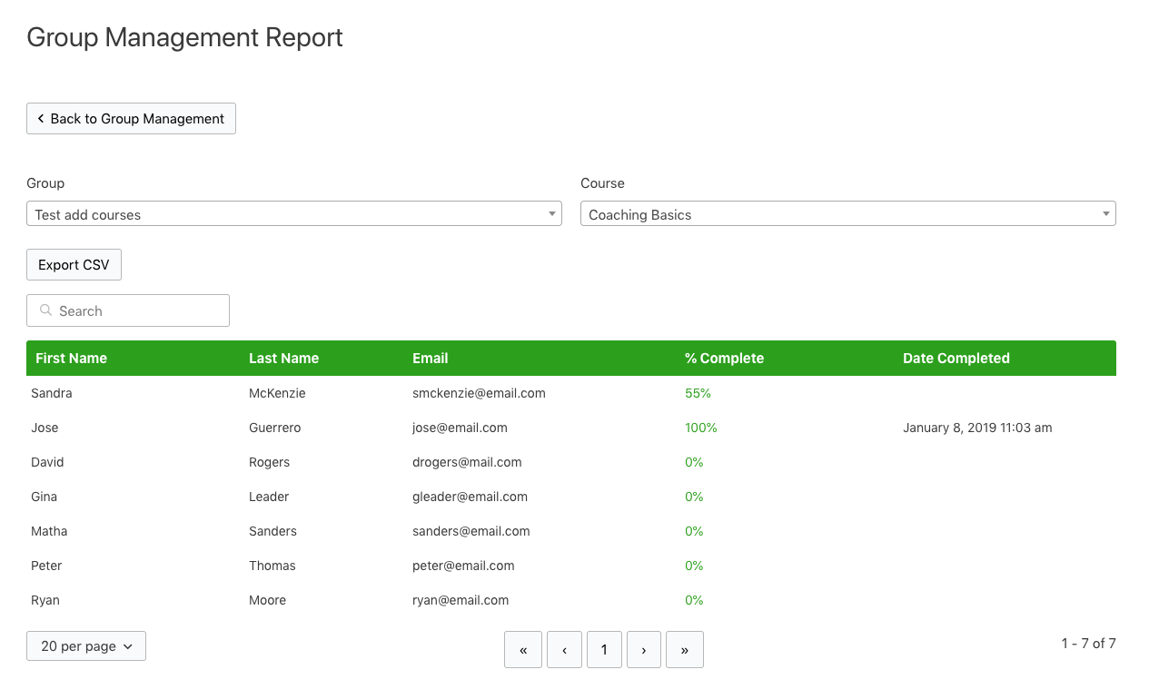 To view the Group Course Report, click on Course under the Reports menu. On the report page, select the group and then the course you would like to report on. In Fig. 2 below, you can see the Management Coaching course has been selected and the Coaching Basics course within that group has been selected for the report. Each report will return the identity of your enrolled users, their % complete, and the date of completion.