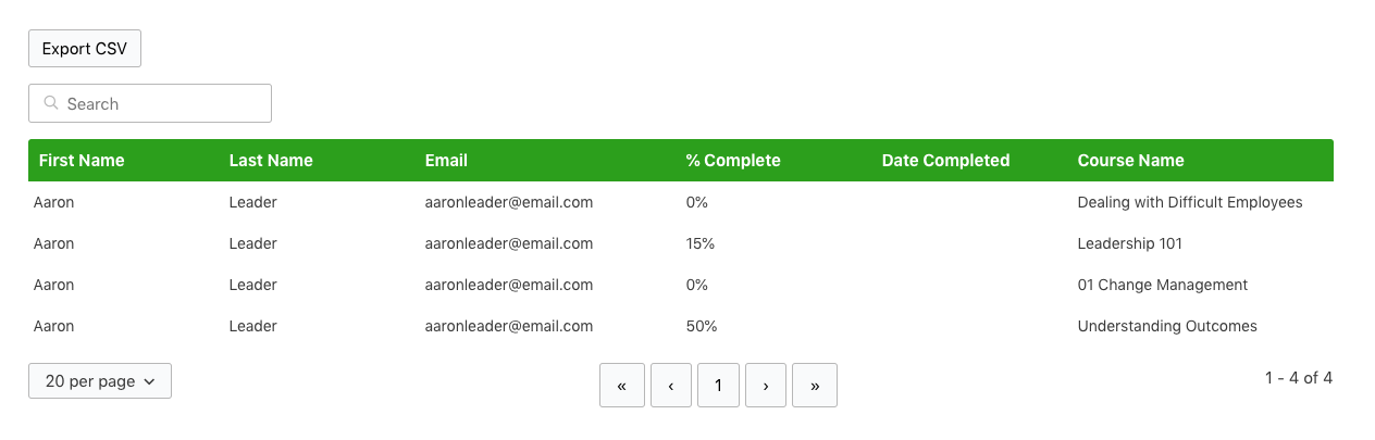 The individual reports shows a individual user’s progress across all of their courses.
