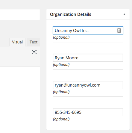 Organization details are added in the metabox to the right of the post body. A screenshot of the 4 optional values for the group is included to the right.