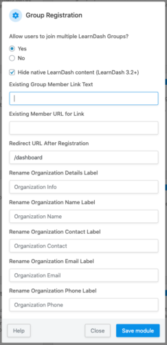 Because this module is typically used to give organizations a way to have their users enrol into their LearnDash Group, we added an optional way of providing group contact details. Each organization’s values are set from the Edit Group page, but the labels must be set here. Instead of Organization, you might want School, Team, Location, or something else entirely. The information itself is added to the registration page sidebars automatically (if it’s populated for the Group) so users registering from the page have confirmation they’re on the right group page and have a way to contact a representative if they need assistance.