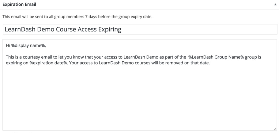 Beneath the expiration date is an Expiration Email metabox. You can set both the subject line and body for the notification email. In the body of the email, you can include variables for the user’s display name (“%Display Name%”), group name (“%LearnDash Group Name%”) and expiration date (“%Expiration Date%”). Variables are not case sensitive, but we recommend you copy and paste them from the list beneath the body text area. Use the Test Email button to sent a sample expiration email to the site administrator.