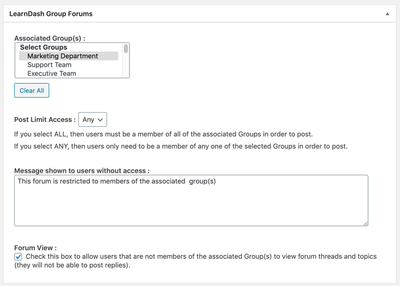 - Example: The Forum View checkbox is checked for the course restriction but not the group restriction. Users that meet only the group restriction will be able view the forum. Users that meet the only the course restriction or neither restriction will see the access denied message set in the group forums Message shown to users without access field.