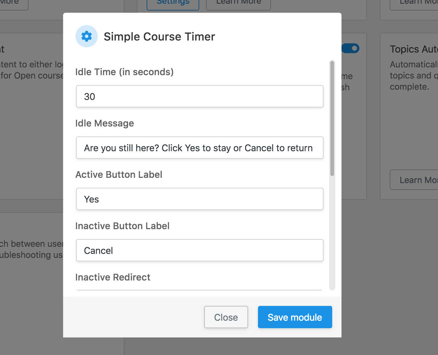 Once time tracking is enabled, you may want to make sure you’re tracking a learner’s actual time spent learning, not just leaving his or her browser open on a course page. That’s why the plugin can stop time from being tracked if a user spends too long on a page. When that happens, a pop-up message is displayed asking the user if they’re still on the page. Confirming activity resumes the timer, while navigating elsewhere or showing the message stops the timer.