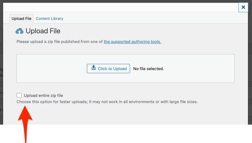 Important: Upload zip files published directly from your authoring tool only. All modules must be uploaded through our upload tool, as it modifies some javascript files in the modules to ensure that statements are tracked properly.