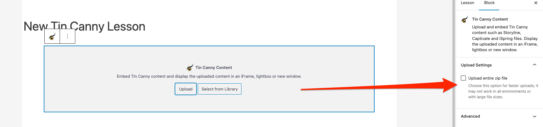 The Tin Canny Uploader is the tool that will allow you to upload your xAPI and SCORM modules to your LearnDash lesson or topic page. The Uploader is integrated with the both the Classic Editor and Gutenberg so you can quickly attach an e-learning module as part of your content creation workflow.