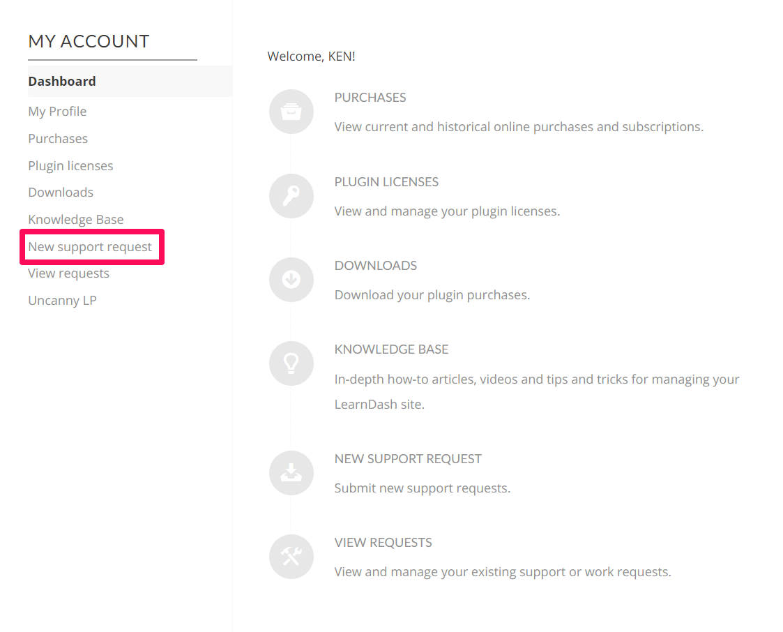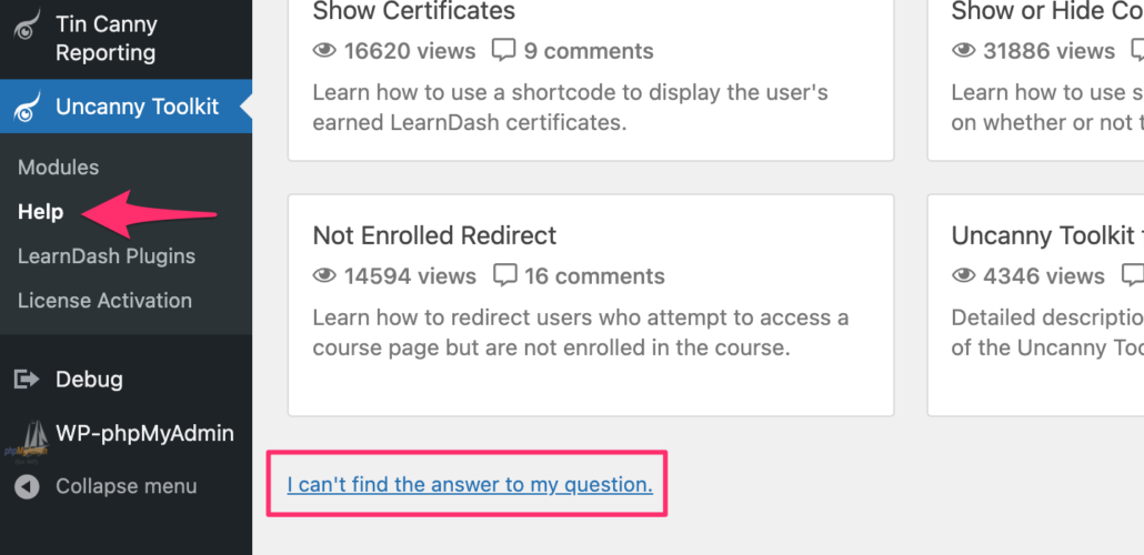 Alternatively, to submit a support request from any of the Uncanny Owl premium plugins, look for the Help page in the /wp-admin menu. At the bottom of that page, click the I can’t find the answer to my question link.