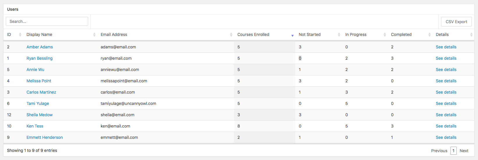 Clicking on the name or email address of a user will take you to a list of courses that the user is enrolled in as well as their overall progress in those courses.