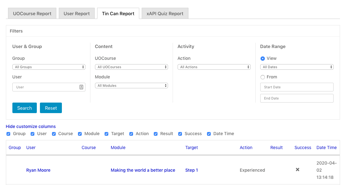 Tin Canny now also supports front end versions of the Tin Can and xAPI Quiz reports. Those reports, for Administrators and Group Leaders, make it easy to see records from uploaded SCORM, uploaded xAPI, and H5P modules. And with the customizable columns and filters, it’s now easier to get the right set of data (even when you might have millions of records).