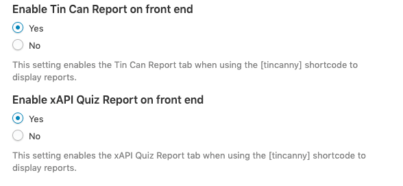 For administrators that don’t want to give Group Leaders access to all of that data in the front end, there are switches to turn the reports on and off when you use the [tincanny] shortcode. Here’s how you can control it: