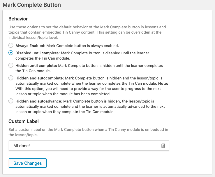 These new options should address all requests that we’ve had for new behaviours in the Mark Complete controls, but as always, send us your feedback about how we can make things even better. Our goal is always to make Tin Canny the easiest and most feature-rich SCORM and xAPI solution for LearnDash platform!