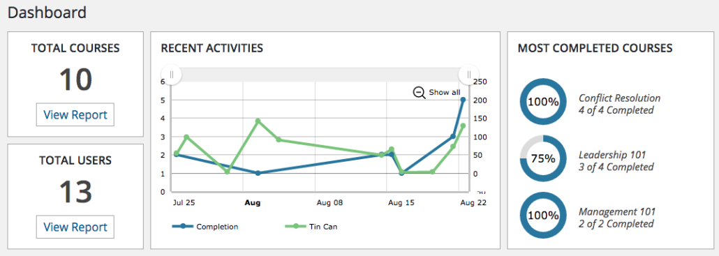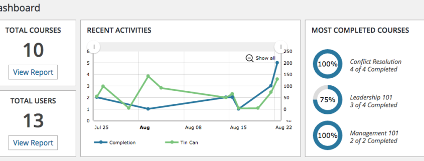 Everything that’s needed for effective Tin Can use is included in the plugin, from a Storyline and Captivate upload tool (that detects Tin Can vs. non-Tin Can automatically and parses XML files for slide names) and a Learning Record Store to dashboard, course, user and Tin Can reports. Simply install the plugin and everything is ready to go. In fact, the only setting is to toggle whether or not to use Tin Can (as this plugin is also a fantastic LearnDash reporting tool without Tin Can).