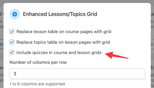 The Enhanced Lessons/Topics Grid gained a new setting for showing quizzes in grids. This makes it possible to show quizzes alongside lessons or topics when they’re set at the same level. It looks like this: