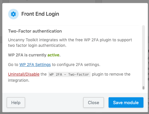 The use of two-factor authentication is of course completely optional, but we’ve made it as easy as possible to install the WP 2FA plugin should you want to enable it. From the Front End Login module settings page in Uncanny Toolkit > Modules, there’s a 1-click install option at the very bottom of the settings. Once installed, the Front End Login module will confirm it’s active and add an easy link to set up 2FA settings.
