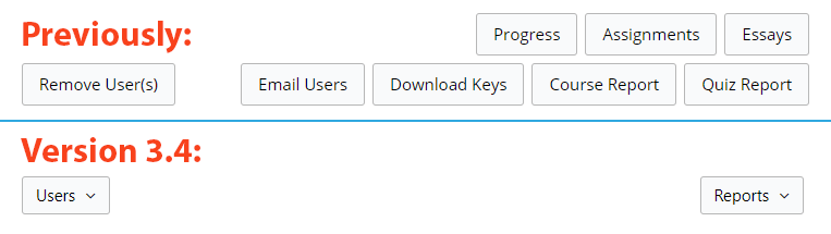 The biggest change in the 3.4 release is to the main Group Management page interface. When we launched the very first version, it was really simple; there was a way to add users and there were simple course and quiz reports. It was simple and uncluttered. Then we added a function to email users, an assignment management page, an essay management tool, a way to manage user progress… and it just got really busy and confusing.