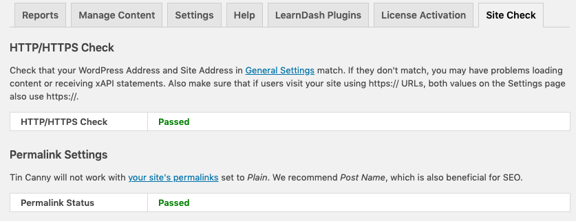Next up, Site Check. We were getting too many of the same support requests over and over related to common environmental issues. Mark Complete button not updating? Something is probably blocking the endpoint, like a .htaccess password or security plugin. Content not showing up? Possibly an http vs. https mismatch. Nothing working? Maybe the permalinks are invalid. For some of these common issues, Tin Canny now offers a Site Check tool to rule out the most common problems, and if any are found, it suggests why they might be happening and how to fix them.
